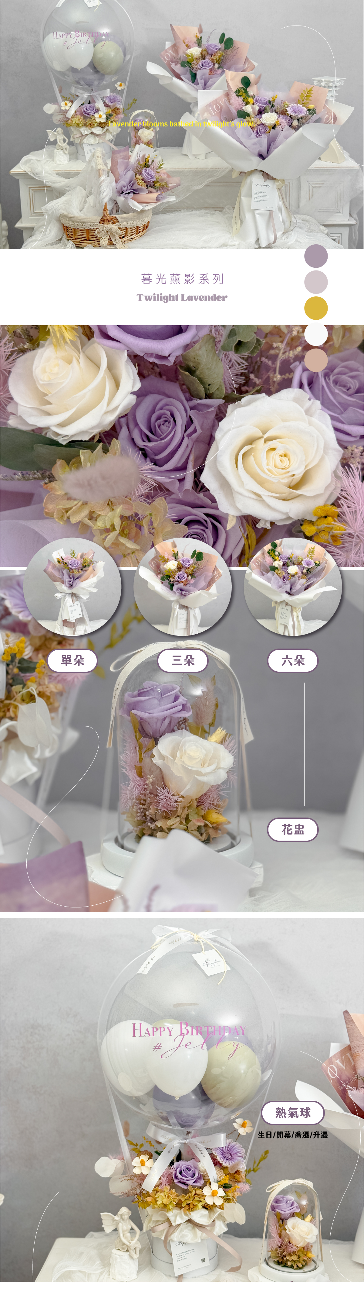 以淺紫色永生玫瑰搭配永生花材,精緻包裝呈現溫柔與高級的平衡感