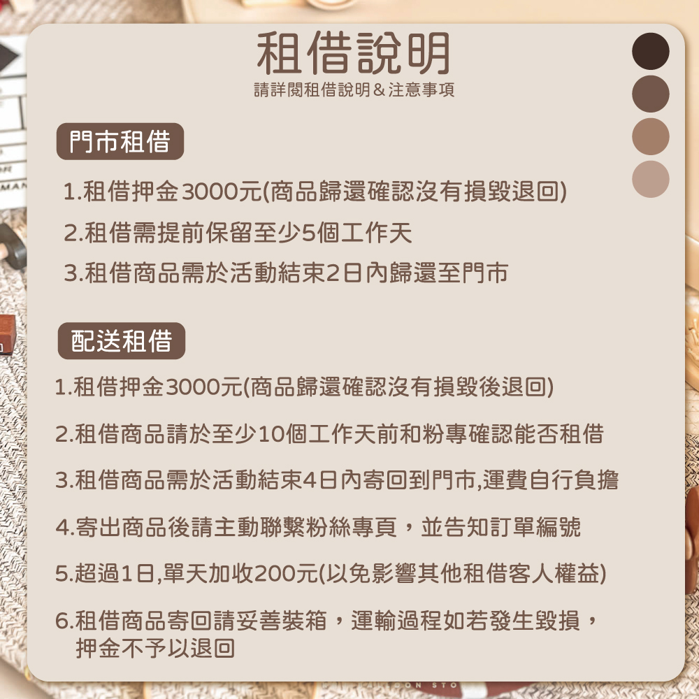 1.租借押金3000元(商品歸還確認沒有損毀退回)